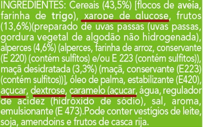 - Assinalados a vermelho estão os diferentes tipos de açúcar. Uma barra tão pequena consegue ter quatro (às vezes mais) tipos de açúcares adicionados.